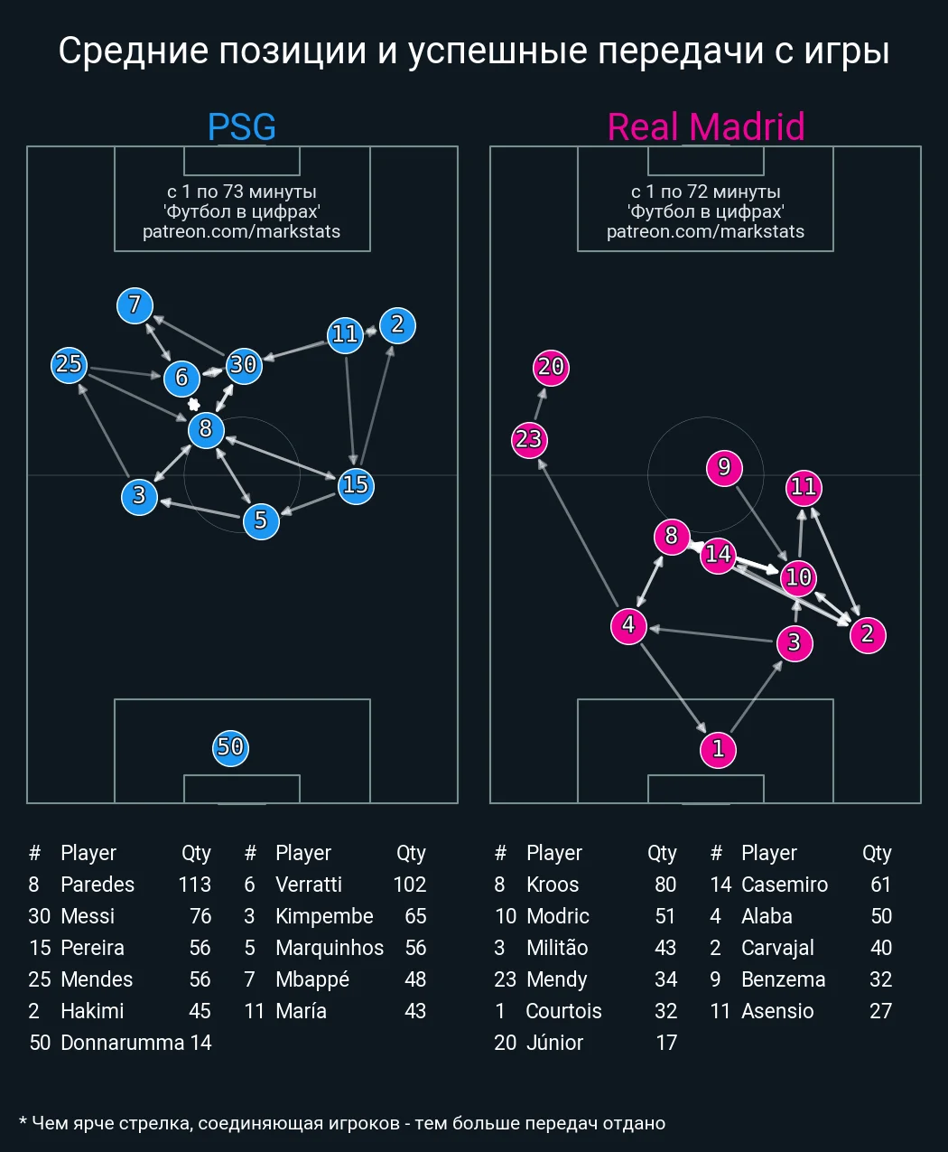 Маурисио Почеттино, кажется, понял, как правильно использовать Лео. Нападающий получил роль глубинного плеймейкера – в первом тайме против Реала он постоянно опускался в линию к Паредесу и Верратти, обыгрываясь с партнерами, создавая варианты для передач в разных зонах и продвигая мяч через пасы и дриблинг. В частности, именно Лионель запустил черпачок под выход Мбаппе один на один на 20-й минуте. После перерыва же Месси переключился, разгоняя быстрые атаки с глубоких позиций. Играя в такой роли, Лео стал лидером почти по всем ключевым атакующим метрикам.