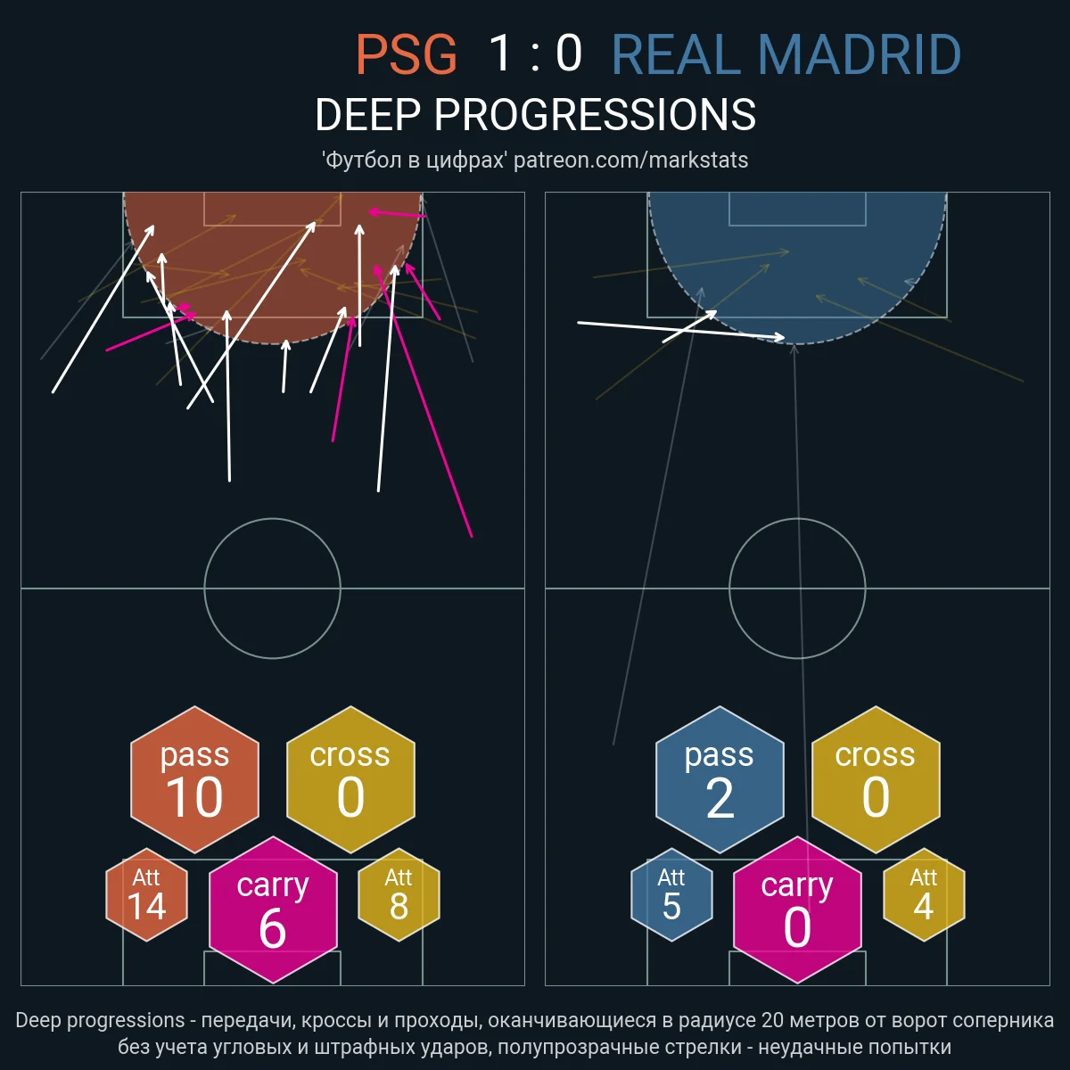 "Королевский клуб" отвык от такой агрессии. В Испании мадридцы идут 16-ми по интенсивности собственного прессинга, а соперники возвращают мяч через 10 секунд после потери лишь в 16% случаев. ПСЖ возвращал 36% владений. Как следствие, Реал не провел ни одного удара после контратаки и пробил по воротам только 3 раза (худший показатель за 18 лет), вообще не попав в створ.