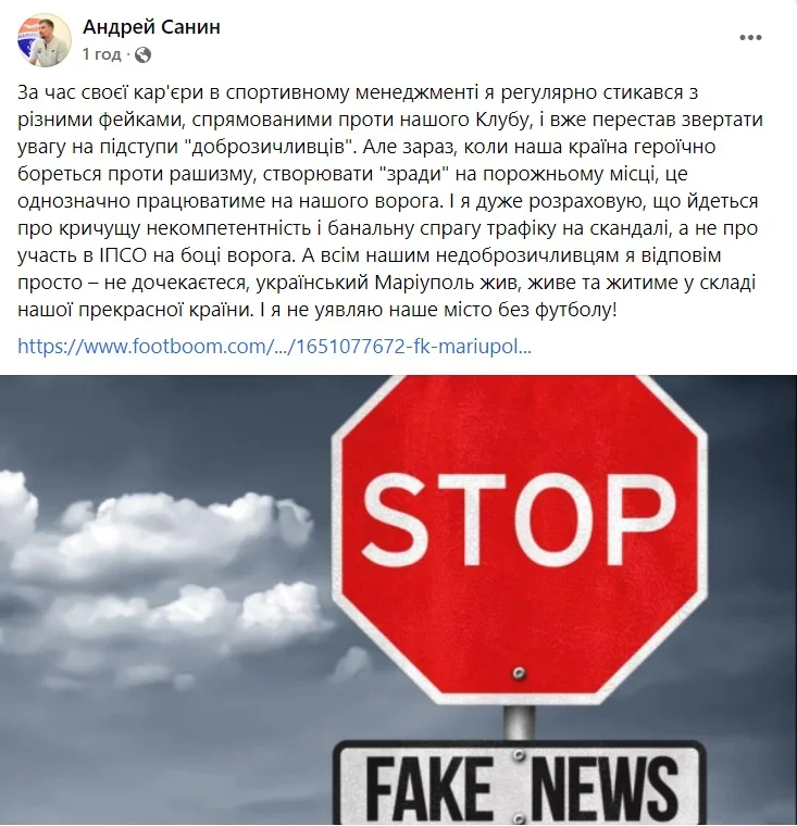 А всем нашим недоброжелателям я отвечу просто – не дождетесь, украинский Мариуполь жил, живет и будет жить в нашей прекрасной стране. И я не представляю наш город без футбола", – написал Санин в Facebook.