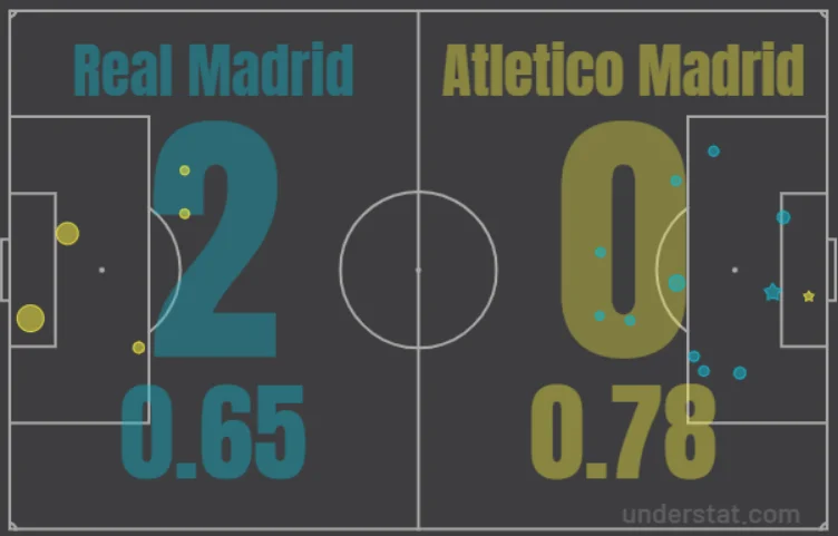 При этом Реал тjже ничего невероятного не продемонстрировал. Да, команда катала мяч и шкарно отработала позиционно, однако за 92 минуты хозяева создали лишь четыре момента – штангу Бензема, два гола и удар Васкеса. Суммарный вес 12 ударов "бланкос" составил аж 0,65 xG – даже у Атлетико было 0,78.