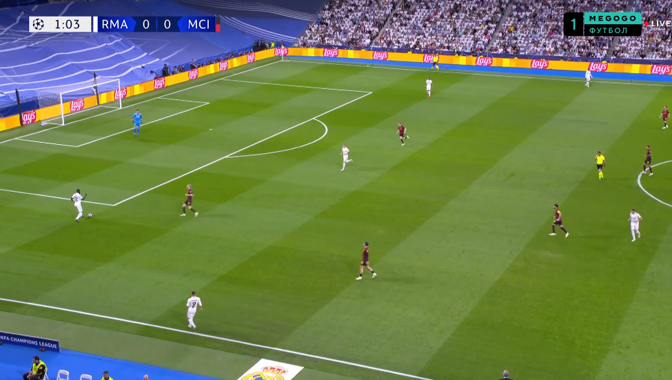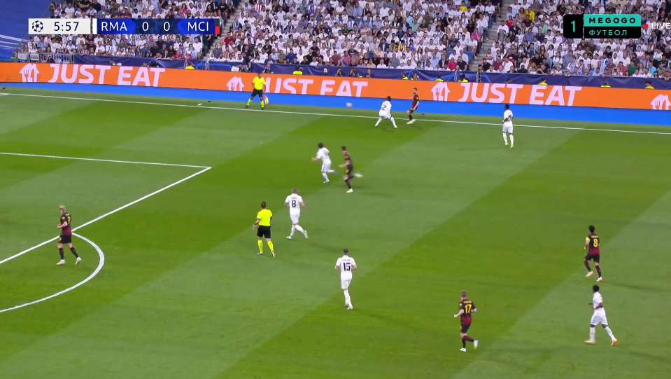 Впрочем, стоит отметить старт комбинации. Ее начал Модрич, рванувший с центра поля на фланг, разгрузив давление на Алабу и Камавингу. При этом он убежал от быстрого Родри, заставив испанца покидать позицию в опорной зоне и преследовать хорвата.