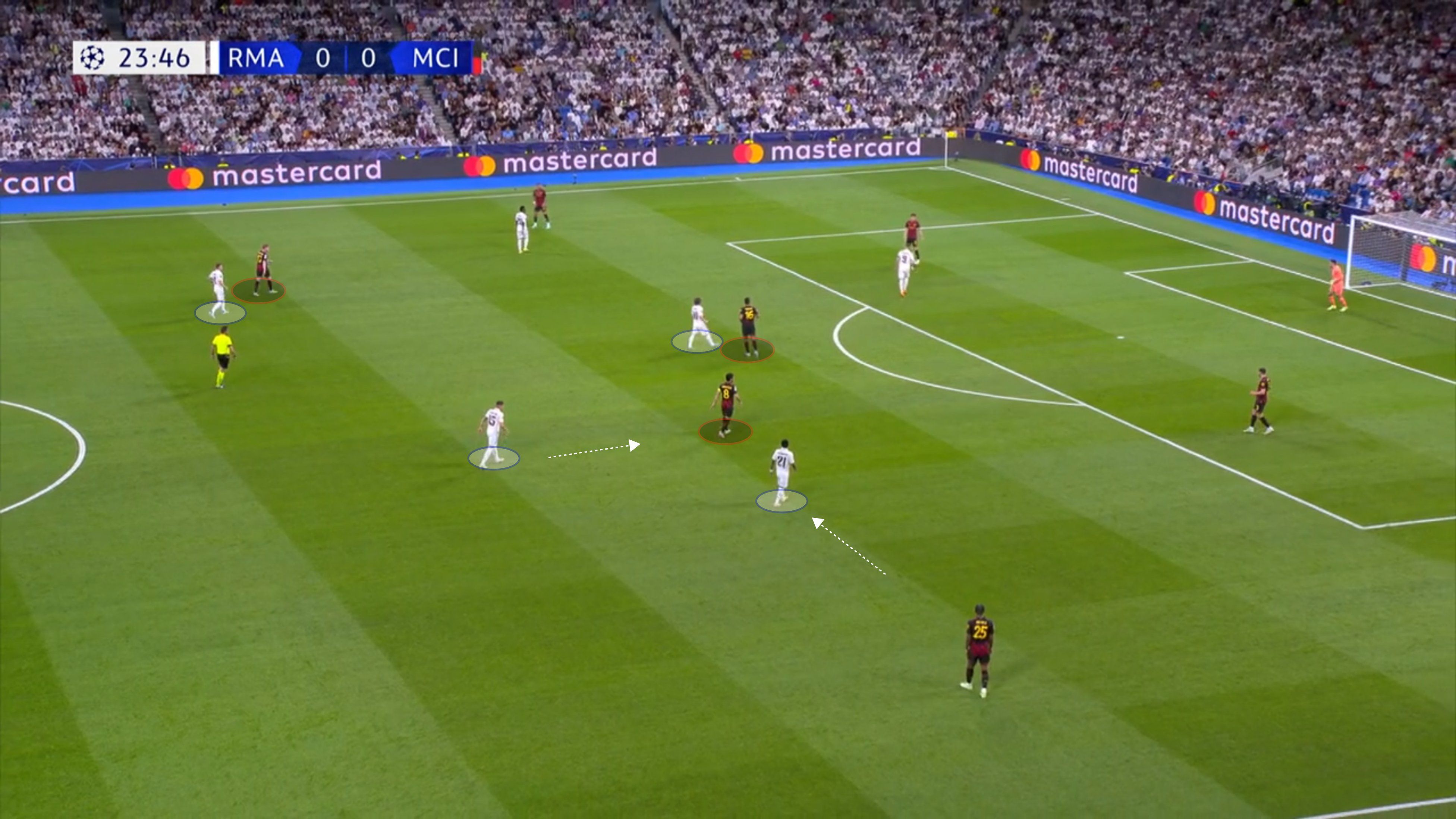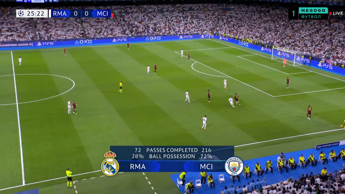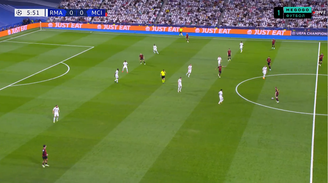 Атака Реала опиралась на организацию рывков Винисиуса и обыгрышей с ним. Вот только в первые 20 минут контригры практически не было (за исключением одного эпизода). Манчестер Сити качественно блокировал варианты для диагоналей на бразильца.
