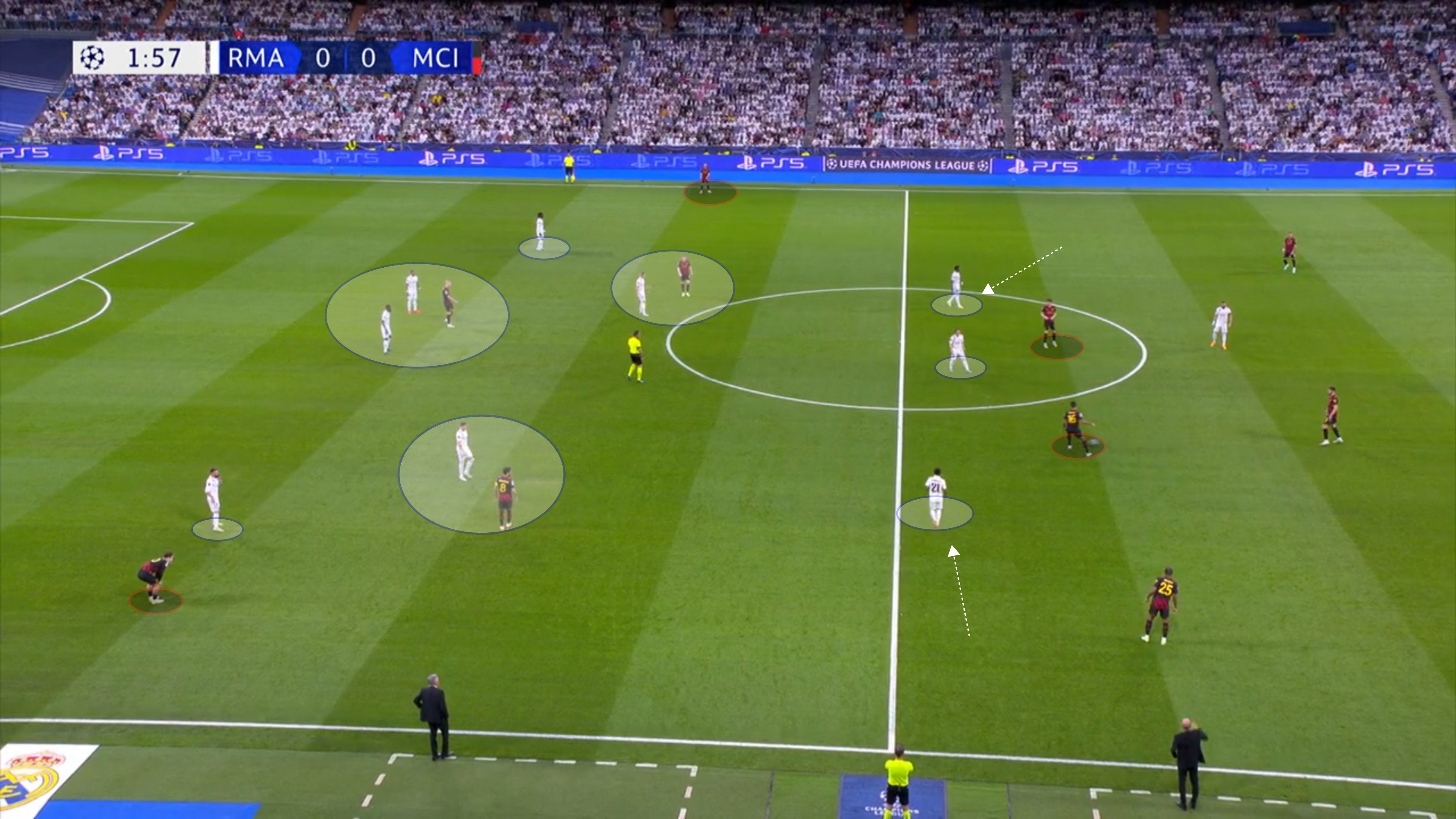 Подопечные Карло Анчелотти в начале встречи отказались от прессинга. Команда отсиживалась в блоке 4-2-3-1, в которой опорники играли по "восьмеркам" Сити (Гюндогану и Кевину).