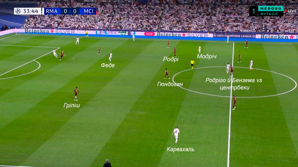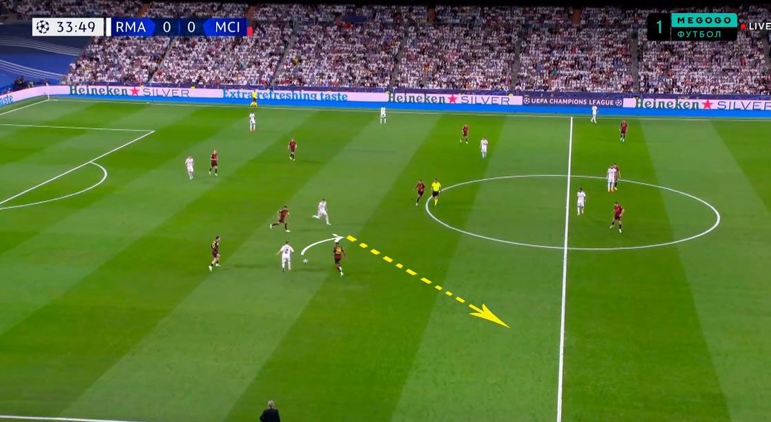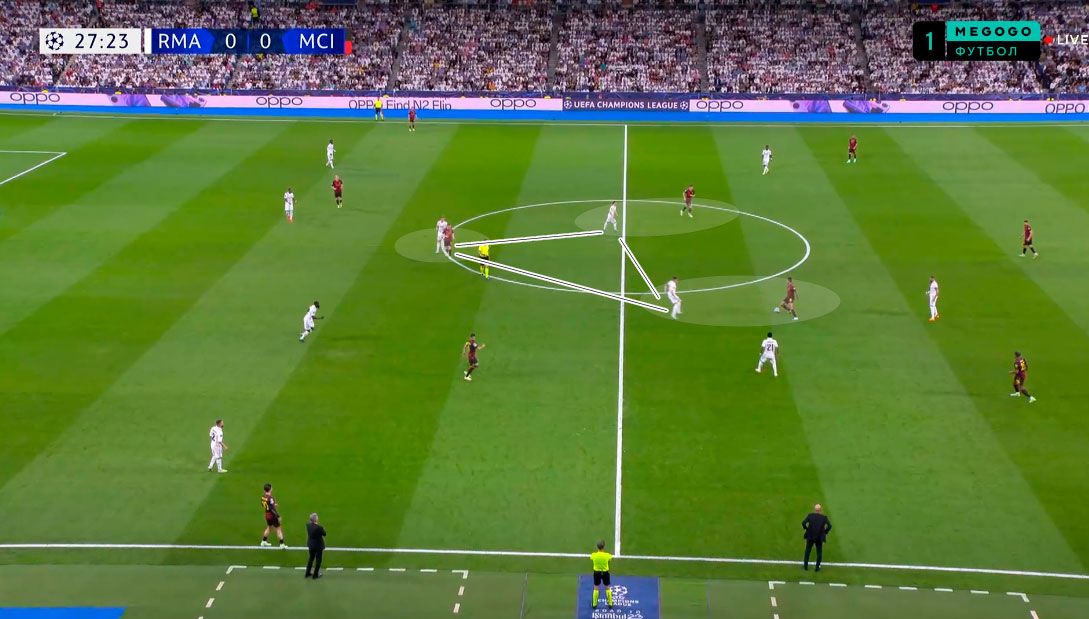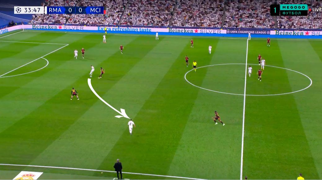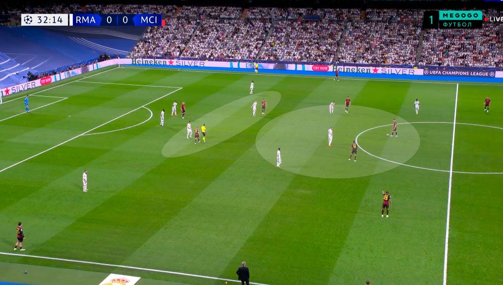Показательный эпизод произошел на 34-й минуте. Кроос опустился в линию к защитникам, а Модрич поднялся высоко в левый полуфланг, заставляя Родри оставаться в глубокой позиции. Вальверде открылся между линиями, провоцируя выдергивание Гюндогана.