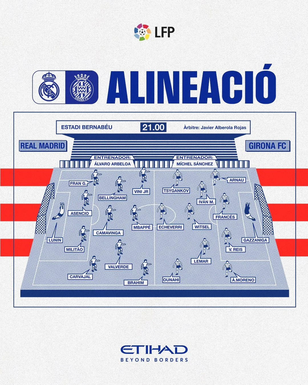 Жирона: Гассанига – Арнау, Франсес, Рейс, Морено – Іван Мартин, Витсель, Лемар – Цыганков, Ечеверри, Унаи.