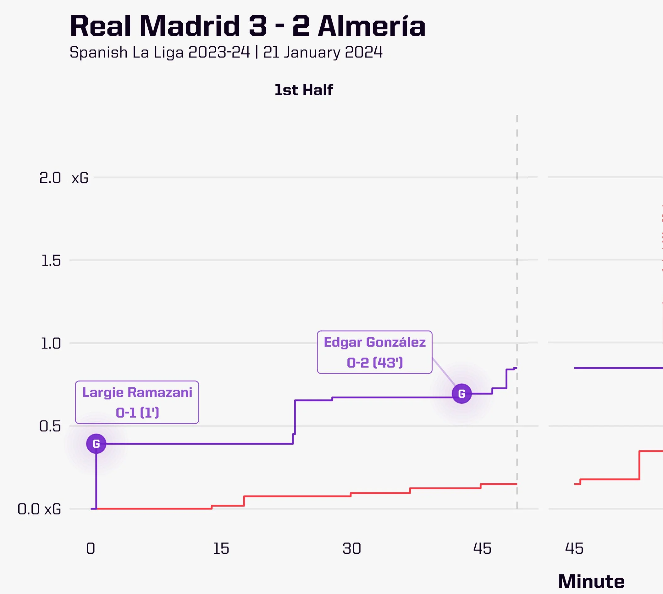 Вместо этого "Сантьяго Бернабеу" наблюдал за худшим часом "сливочных" в сезоне. Первый удар подопечные Карло Анчелотти нанесли аж на 14-й минуте. Первый момент произошел на 34-й, когда Чуми едва не срезал в собственные ворота прострел Карвахаля (причем на замыкание никто из мадридцев не пошел). В общем, до перерыва Реал провел пять ударов, а их суммарная острота составила жалкие 0,13 ожидаемых голов.