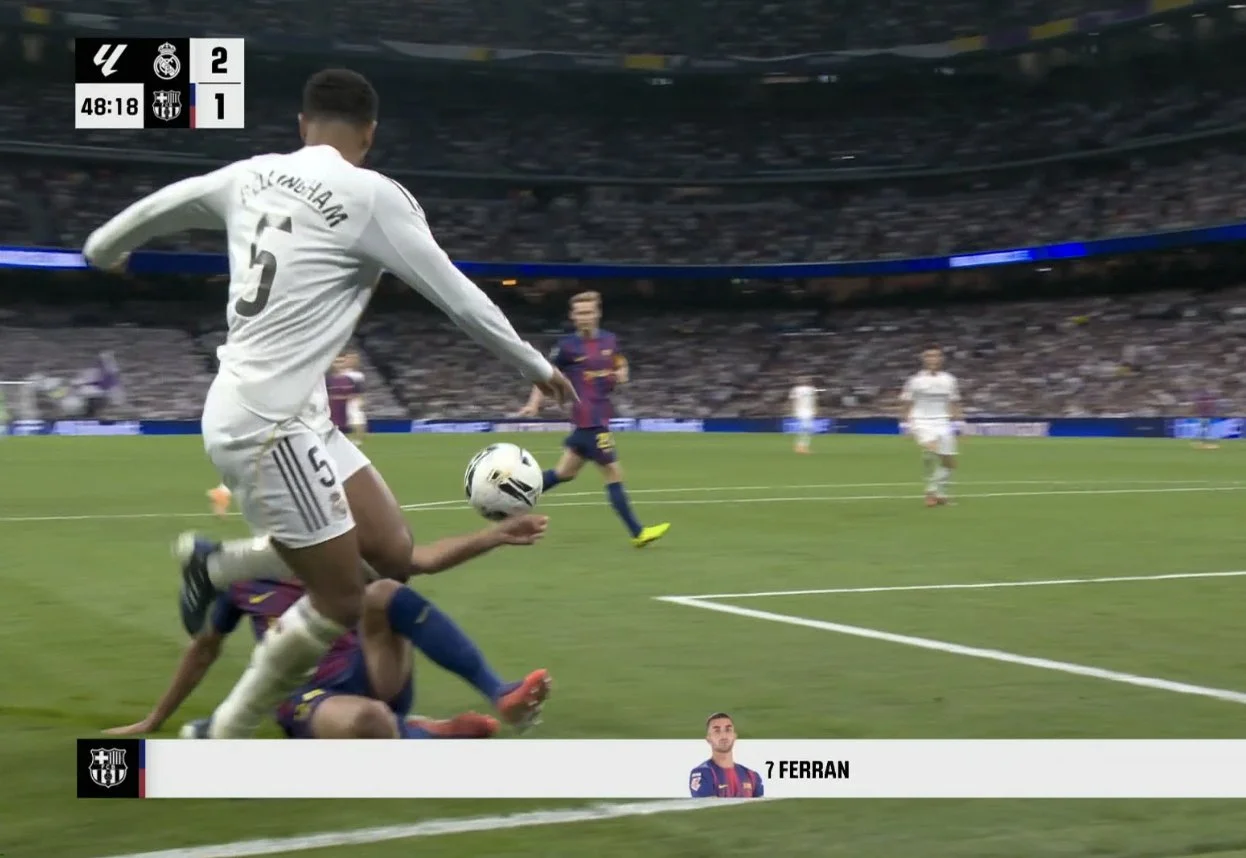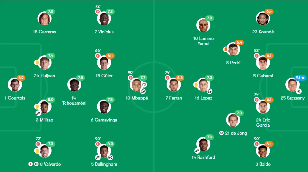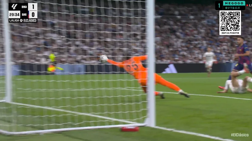 На 29-й же минуте Беллингем заработал штрафной. После его розыгрыша мяч перевели на правый угол штрафной площади, а Мбаппе нанес мощный удар. Щенсны спас Барсу, а после последующего углового спас еще сильнее. Мадридцы дважды вступали в прессинг и отбирали мяч, завершив эпизод подачей Чуамени на дальнюю штангу – Хёйсен замыкал в подкате, однако Войчек выполнил блестящий сейв.