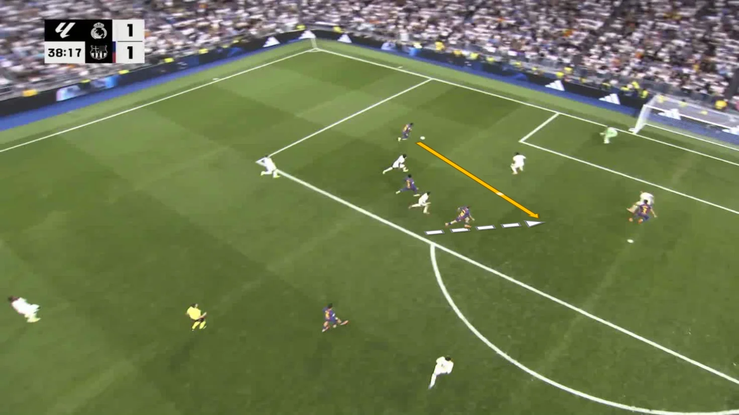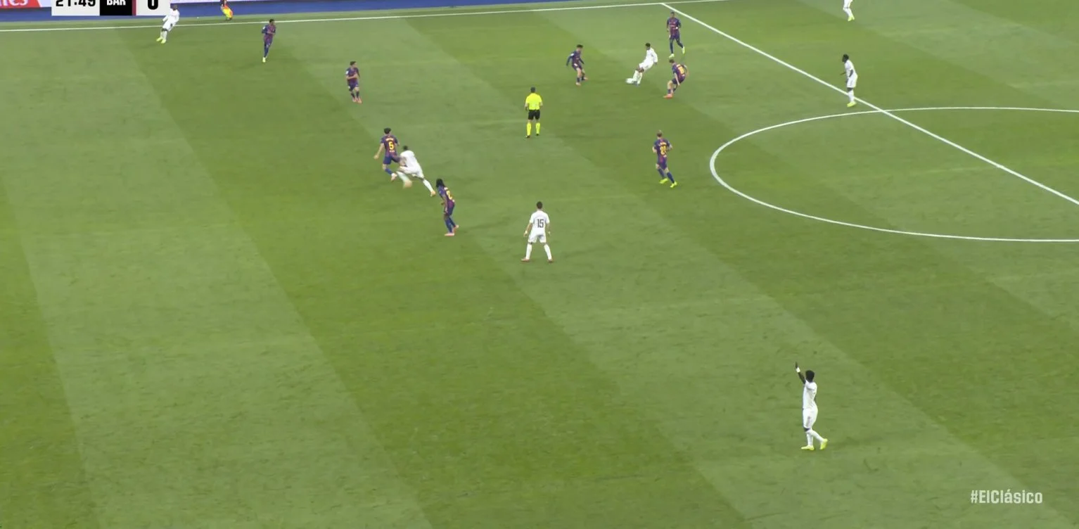 "Бланкос" умело и быстро перестраивались с высокого прессинга на работу в низком блоке. Традиционная сила билд-апа Реала тоже никуда не делась – команда легко разбивала давление гостей, вырываясь на вторую треть через короткие розыгрыши. При этом стоит отметить две проблемы Барселоны – нападающим не хватало агрессии против центрбеков соперника, а за их спинами всегда возникало много пространства.