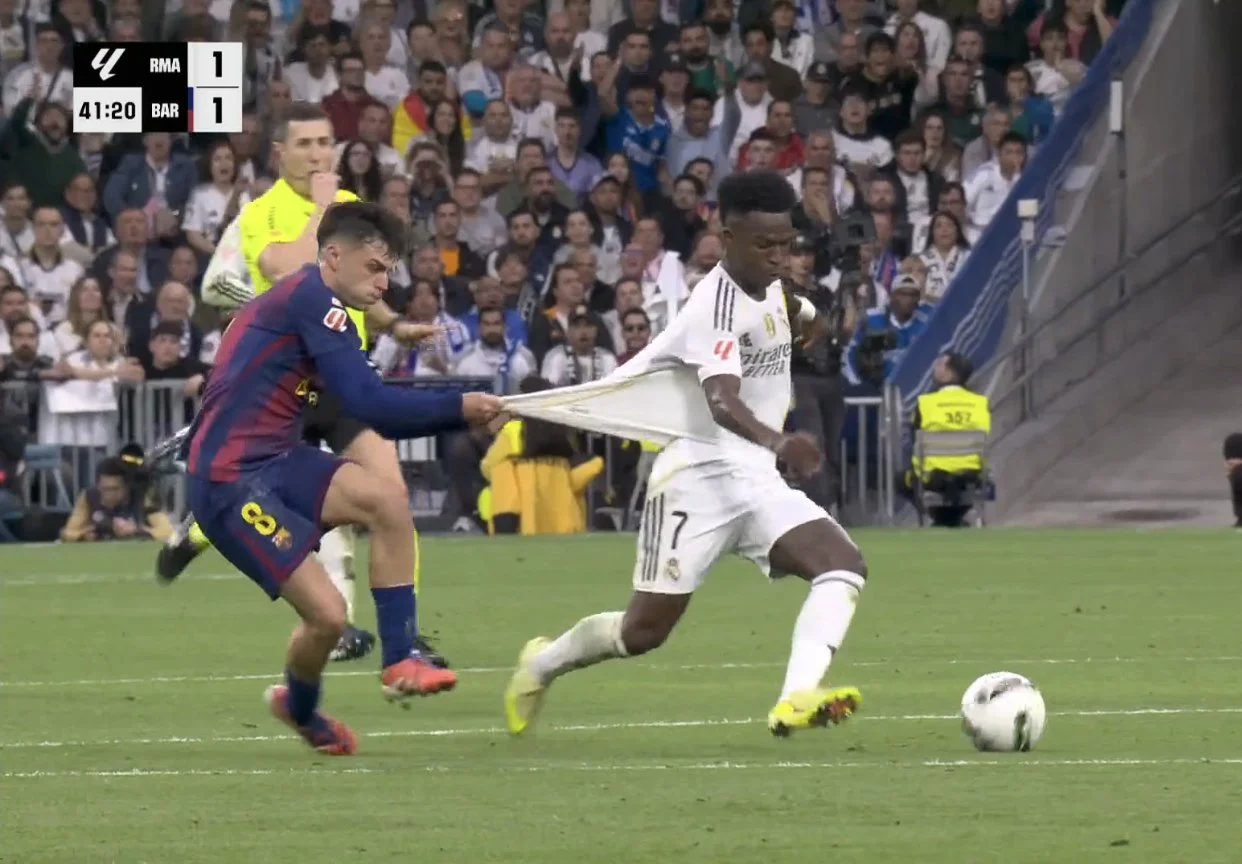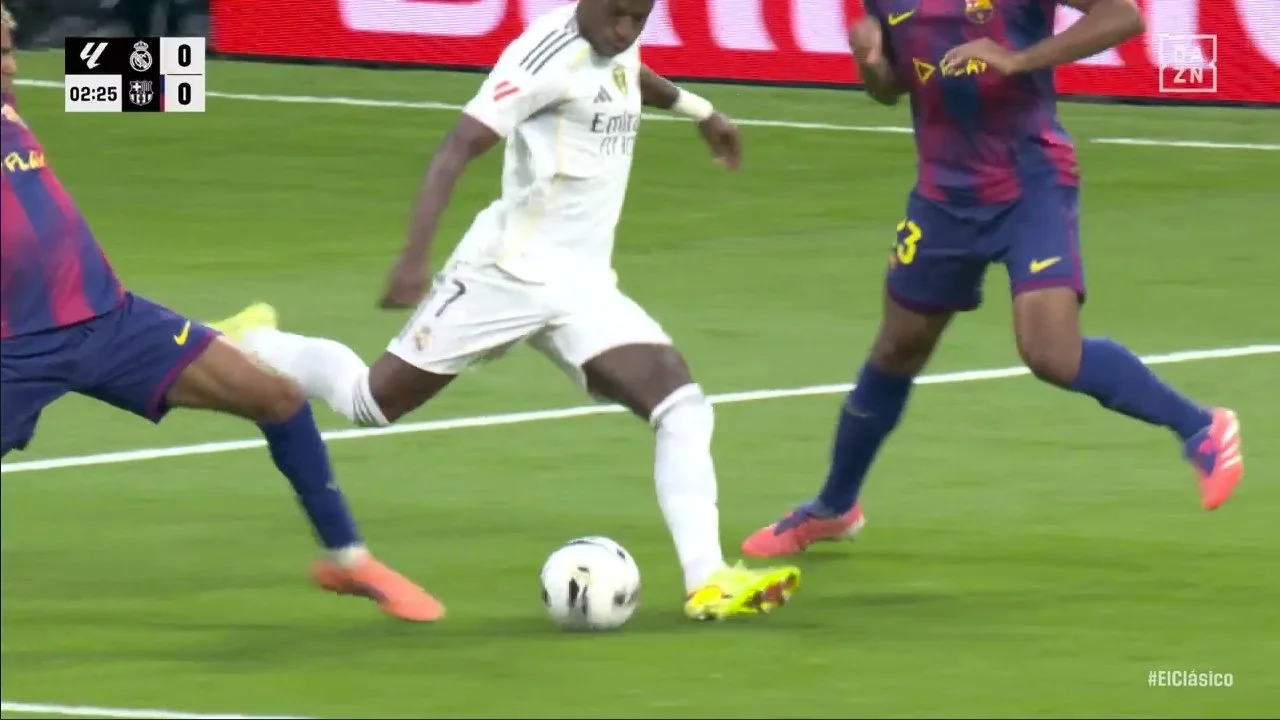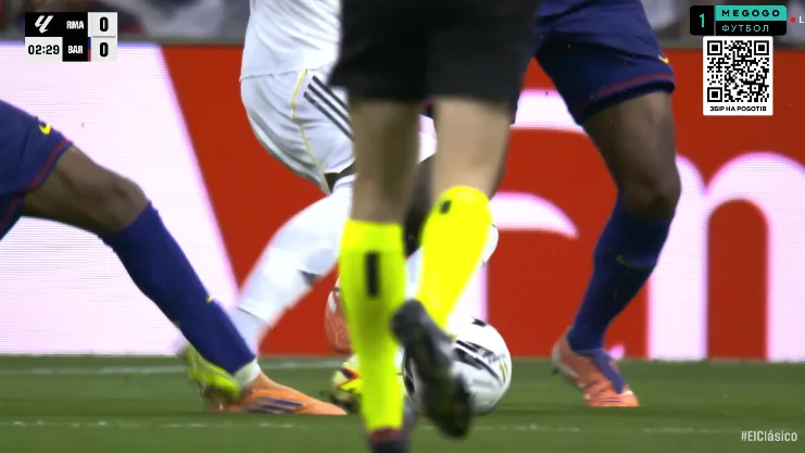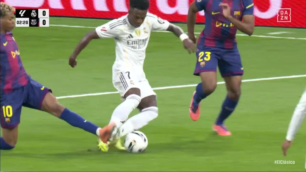 Винисиус оттуда начал смещаться в центр, а Ямаль бросился в подкат – Ламин задел Жуниора, а бразилец сразу упал. Пенальти! Впрочем, повтор показал, что это Винисиус подбил ногу каталонца. Просмотрев видео, арбитр Сесар Сото Градо решил отменить 11-метровый.
