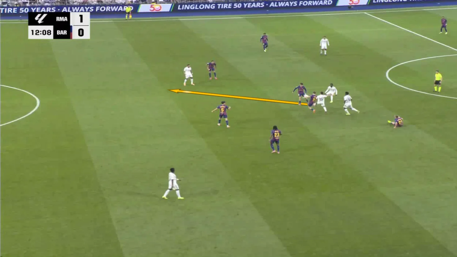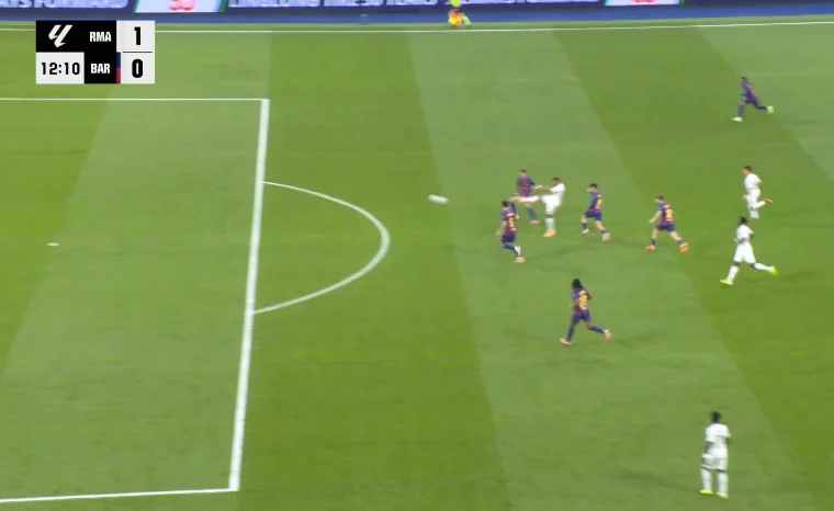 Барселона огрызнулась на 10-й минуте, когда Фермин выполнил заброску в ход Рашфорду. Куртуа опередил англичанина. Реал же продолжил оказывать бешеный прессинг с мгновенными попытками забрасывать на Мбаппе – и этот футбол принес гол уже на 12-й минуте.