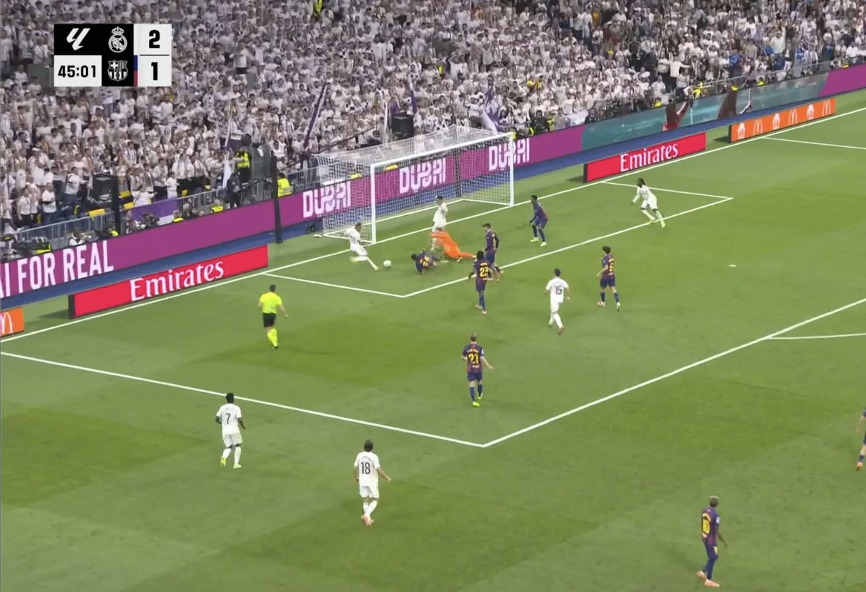 Барсу колыхнуло. Реал пошел большими силами вперед и забил третий гол в компенсированное время. Винисиус раскрутился на левом фланге и прострелил в линию штрафной, а Гюлер оттуда забросил мяч за спины на Мбаппе – Килиан же мгновенно сбросил Беллингему. Джуду пробить не дали, но француз вколотил с отскока в пустые.