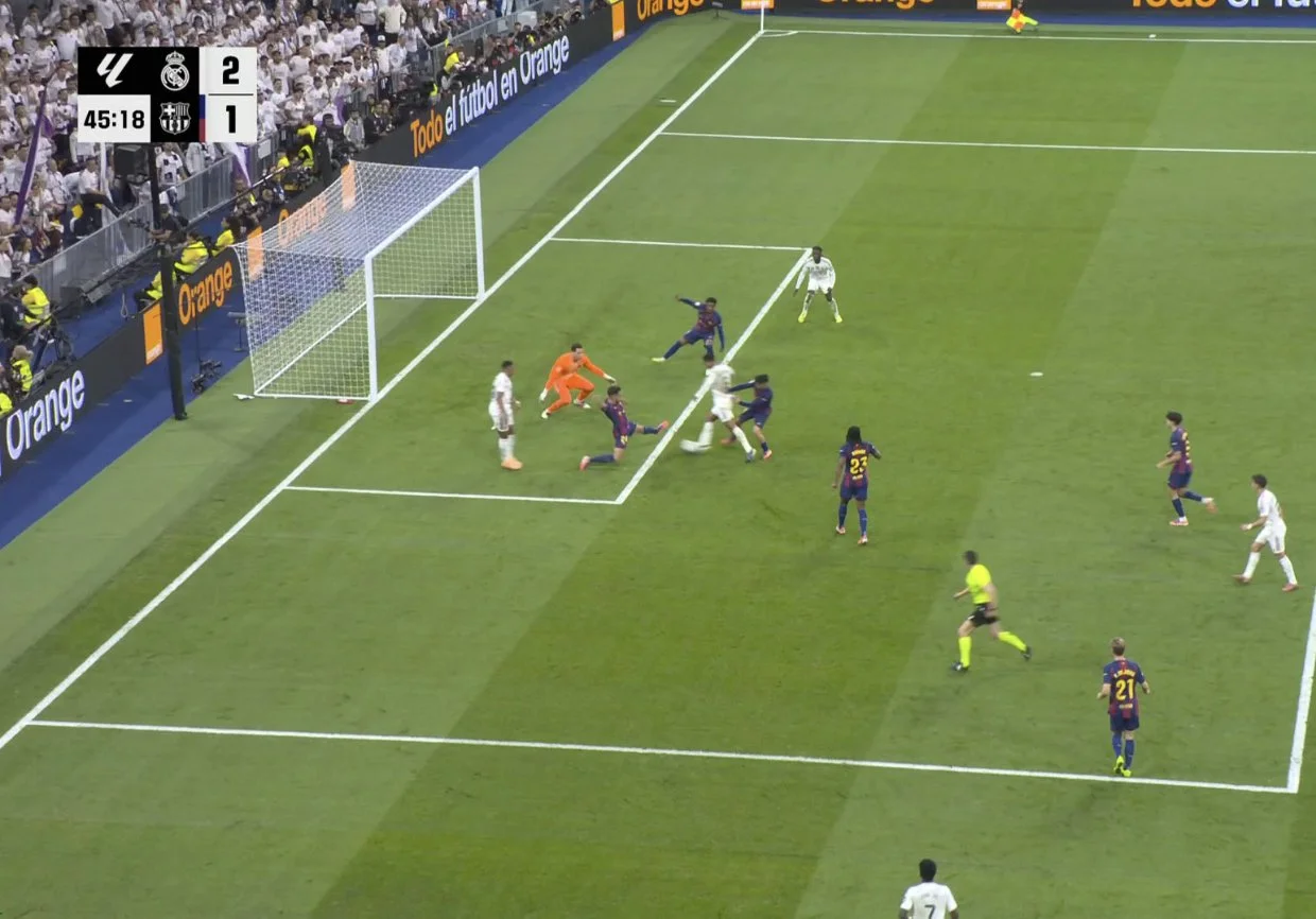 Содержание игры в начале второго тайма не изменилось. Каталонцы все так же не могли овладеть заведенностью Реала в прессинге и постоянно теряли быстроногих мадридцев за спиной. Уже через минуту после перерыва хозяева могли забивать третий гол – это Винисиус ворвался на левый угол вратарской и пробил из-под защитника. Мяч срезался под ближнюю стойку, но Щенсны выполнил сейв.