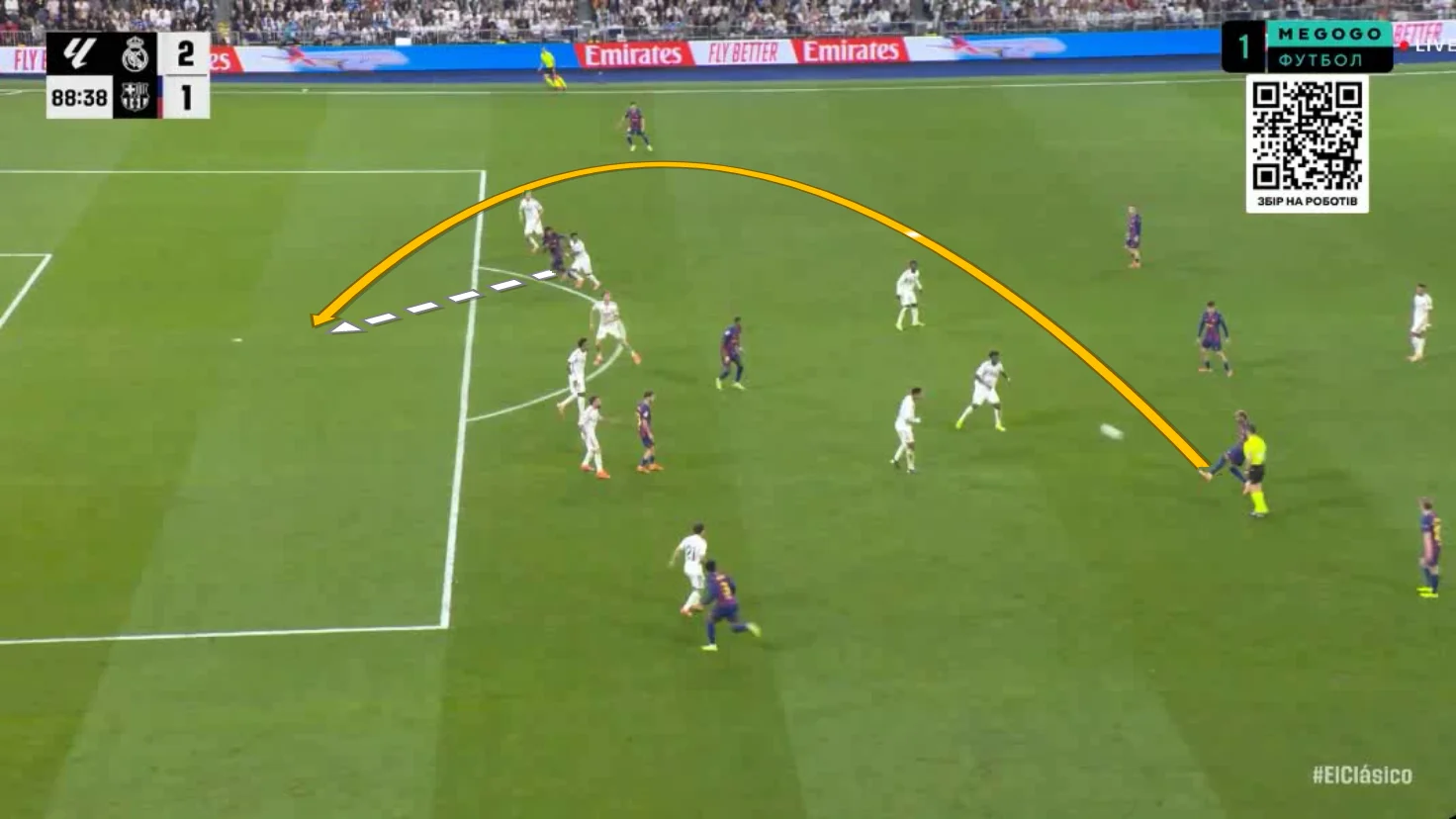 Этот фол не помог – со стандарта мяч мгновенно отправили на левый фланг, где включился Винисиус. Жуниор убежал от Кунде и выполнил очень неудобный навес на дальнюю, однако там неожиданно оказался центрбек Милитао. Бразилец выиграл верховую дуэль и сбросил сферу вдоль ворот, а Беллингем замкнул в пустые. 2:1!