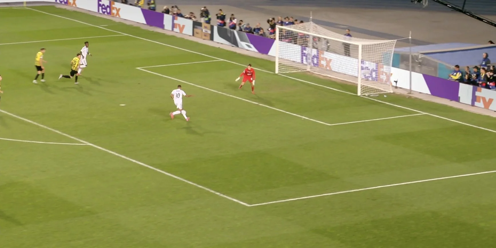 Тогда Мбаппе попытался сделать все сам. На 44-й минуте он открылся под проникающий пас Мастантуоно, пробросил мяч между ног Мати и выстрелил с острого угла. Мяч прошел в сантиметрах от левого верхнего угла!