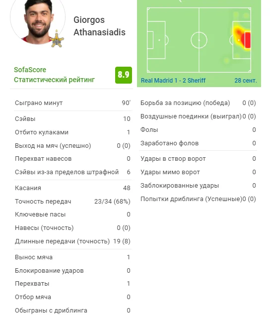 Еще против Шахтера этот эллин выдал парочку эффектных сейвов, а вот в Мадриде поймал настоящий кураж. Десять сейвов за матч, причем даже лицом – после убийственного выстрела Модрича! Безусловно лучший игрок матча – при всем уважении к красивым голам Яхшибоева и особенно Тилля. Без замечательной реакции Атанасиадиса все усилия Шерифа были бы напрасными.