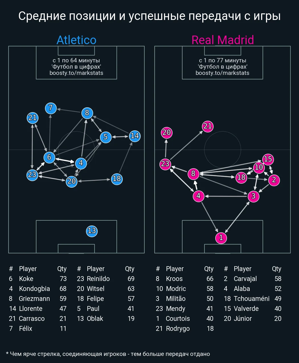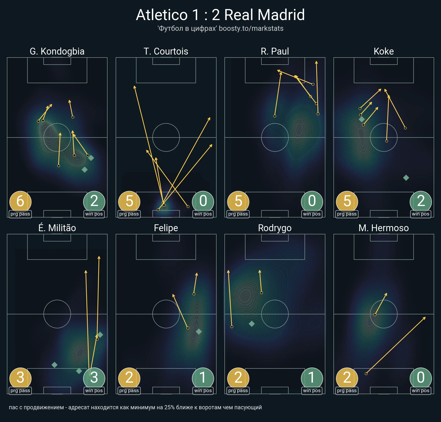 Конечно, без проникающих пасов Атлетико поле не покинул, но их возникало немного. До зоны 20-ти метров от ворот дошло всего 7 таких передач (плюс 6 врываний на дриблинге), а суммарная острота дистрибуции и моментов осталась низкой.