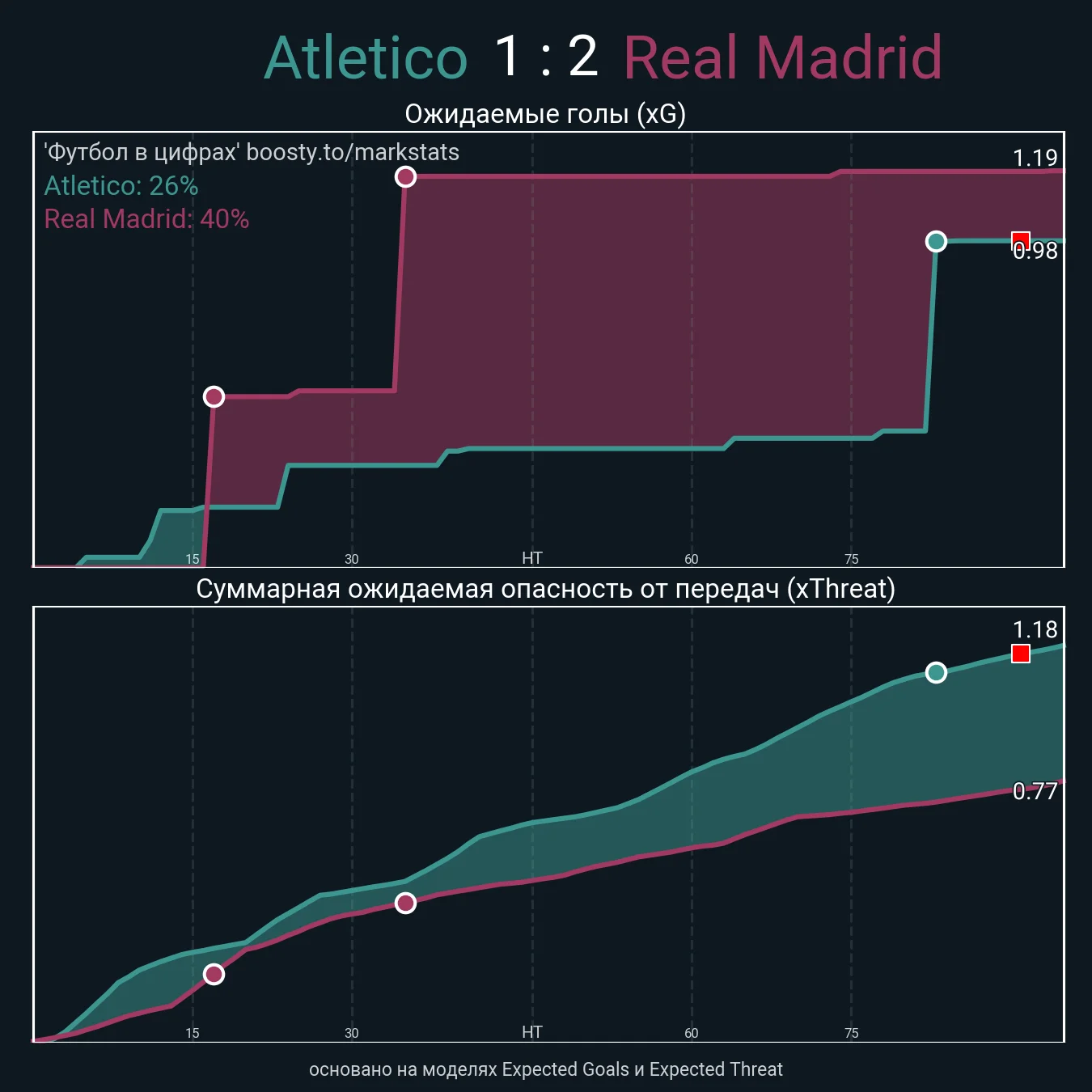 Во втором тайме они не создали ничего ни до гола, ни после. В первом же хозяева имели два момента после стандартов, хороший удар с дистанции и два выстрела из пределов штрафной – но с позиций, где отличиться не так и просто. Все. Атлетико создал 2,5 острых эпизода с игры за 90+ минут, а без учета забитого мяча показатель ожидаемых голов составил 0,5 xG.