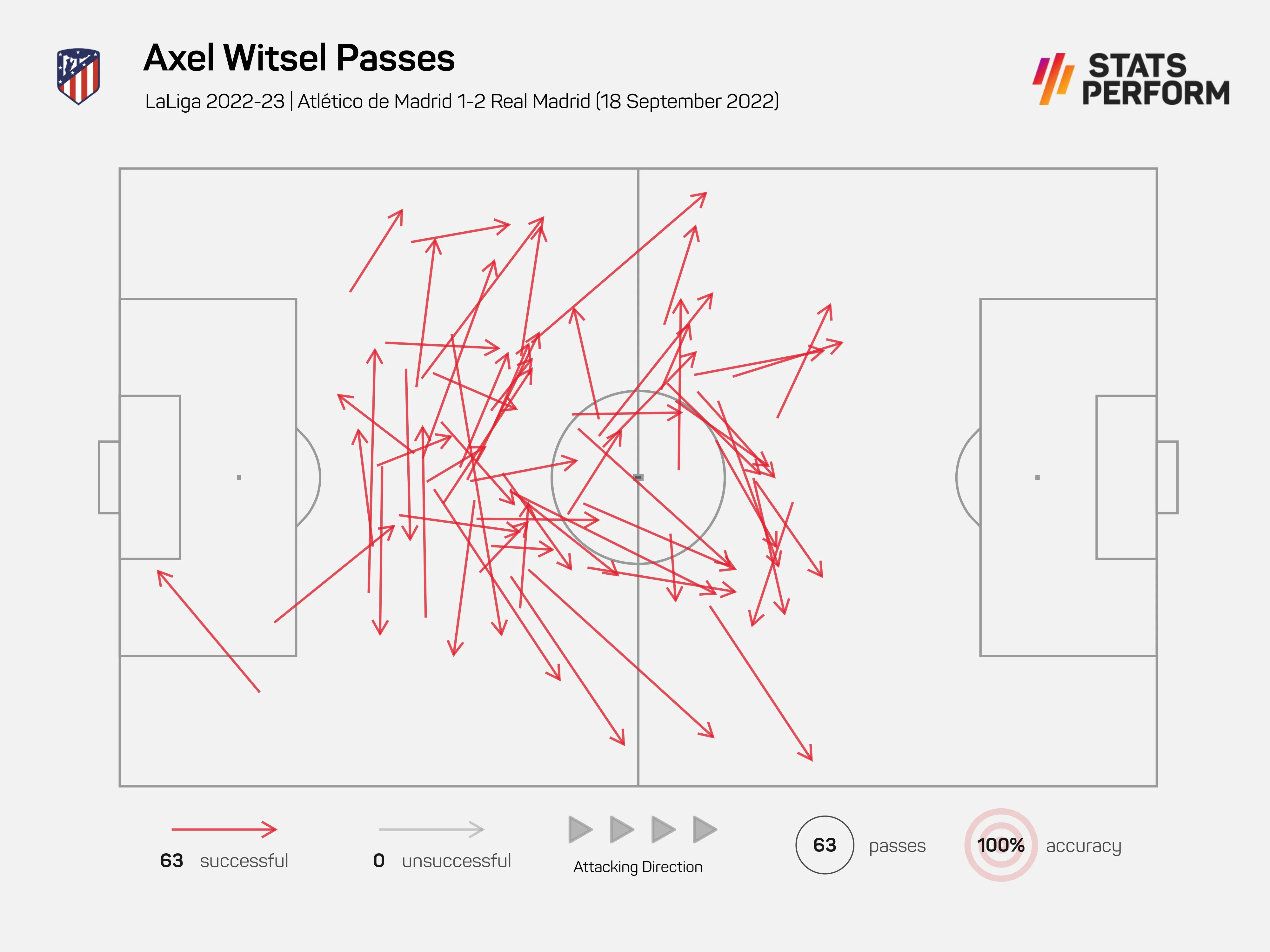Также показательна карта пасов Витцеля. Аксель выполнил аж 63, не ошибившись ни разу. Начиная с сезона 2005/06, никто в мадридском дерби не сделал столько передач со 100-процентной точностью – впрочем, стоит присмотреться к направлениям дистрибуции. Центрхав раздавал передачи на любой вкус и с любой позиции, но только не в финальную треть поля. И не пасовал оттуда. Реал все перекрыл.