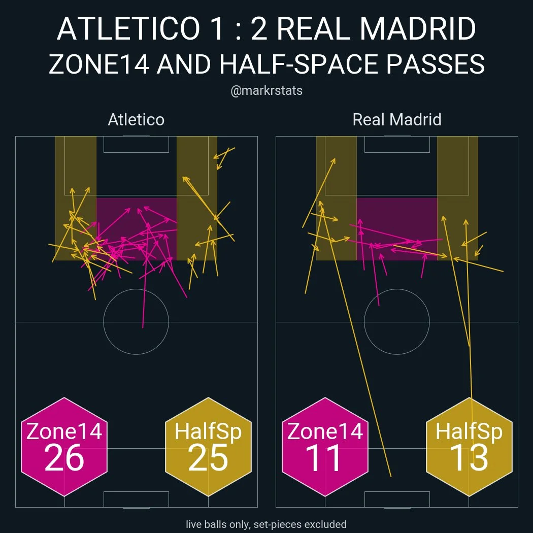 С Атлетико чемпион сыграл даже прагматичнее. Что и говорить, когда у Реала всего 4 касания в чужой штрафной и 0 высоких возвратов мяча, а карта пасов в зонах перед штрафной выглядит вот так: