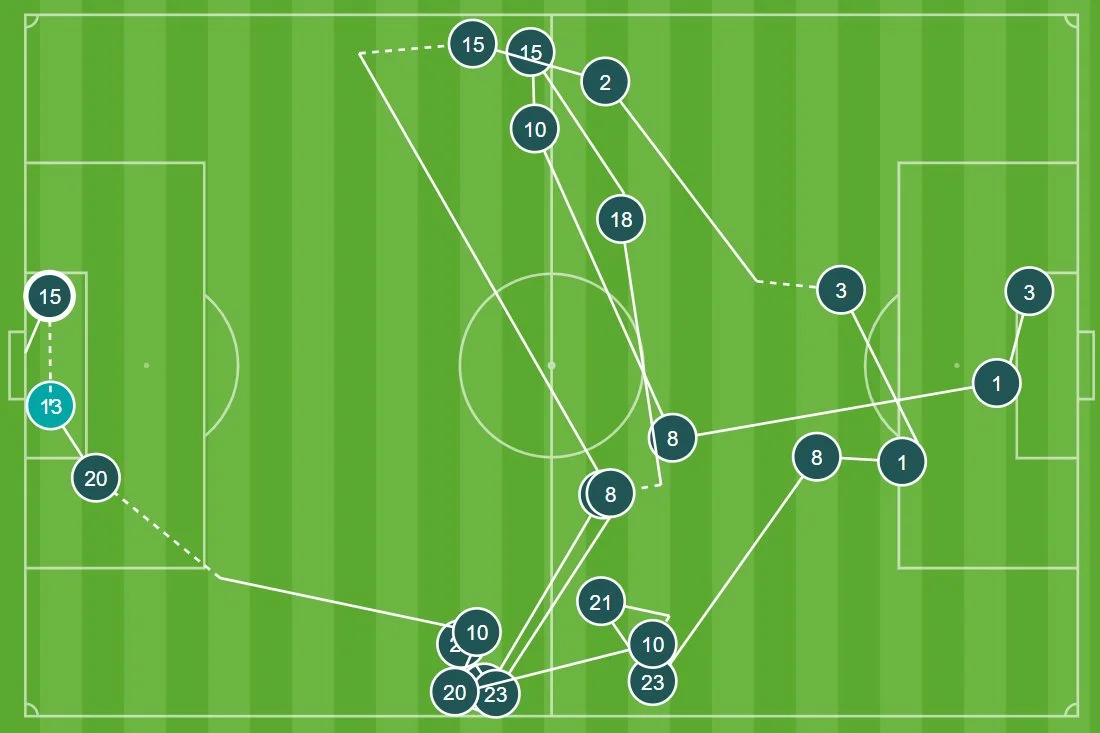 При этом нельзя сказать, что Реал просто отдает инициативу и ловит на контратаках. Все моменты "бланкос" были подготовлены в глубине, став следствием эффективных открываний и мгновенной оценки ситуации. Тот же гол Родриго начался с обыгрыша бразильца с Чуамени вдали от штрафной, а перед вторым голом чемпионы провели аж 21 пас подряд. Аналогичная история была и в матче против Селтика (22 передачи перед голом, это рекорд ЛЧ для "сливочных").