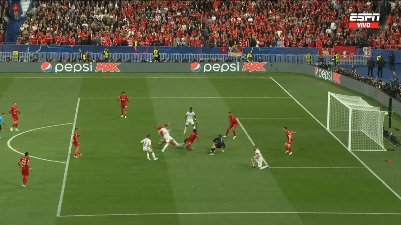 Для Реала всё было совсем грустно. Мадридцы неплохо сдерживали мерсисайдцев при обороне, опуская центрхавов в линию к защитникам и нивелируя угрозу кроссов, но в опорной зоне игроков уже не хватало. С позиционным же наступлением вообще ничего не складывалось. "Бланкос" пытались раскрывать Ливерпуль через создание изоляций для Карвахаля и дальнейшие диагонали, однако они не проходили – а другой идей не было! Как следствие, "сливочные" до перерыва провели всего 6 касаний в штрафной и 1 удар по воротам – на 43-й минуте. Правда, он завершился и голом и скандалом.