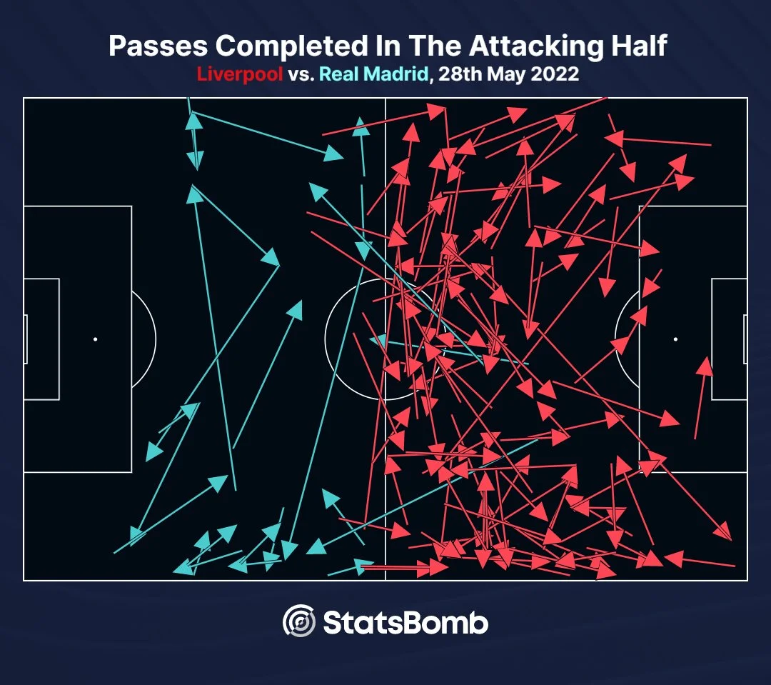 В первом тайме Ливерпулю удалось накрыть и без того шаткую структуру игры Реала. "Красные" держали мяч 61% игрового времени и провели 93 передачи на чужой трети. Карта проведённых на чужую половину пасов в исполнении обеих команд является красноречивой.