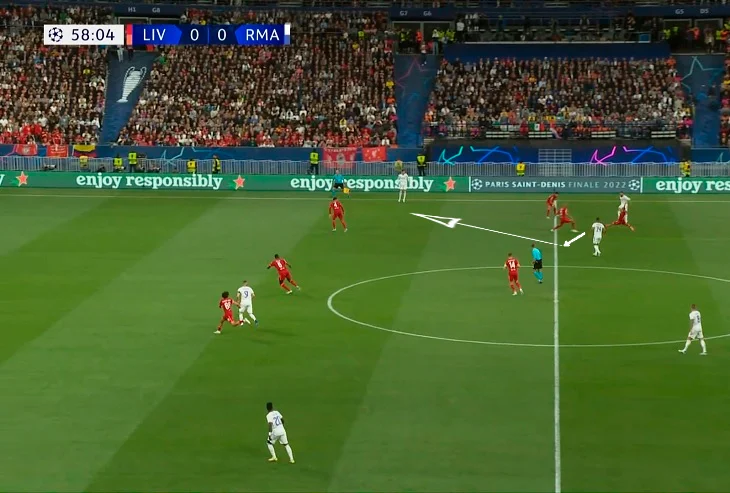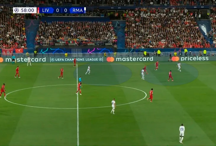 В теории, Ливерпуль могли жестоко наказать, ведь Реал неоднократно доказывал умение подстроиться и выходить из-под прессинга. Тем более что Ливерпуль оставлял приличные разрывы между линиями – впрочем, мадридцам не хватало футболистов в центре из-за опускания Каземиро и других центрхавов в оборону. Опорник таким образом позволял действовать своим фулбекам шире и смелее, не давая исполнять кроссы, а Модрич из-за нарушенных каналов в центре вынужден был опускаться за мячом для начала атаки. Попытки разогнать их через рывки Алабы были сорваны.
