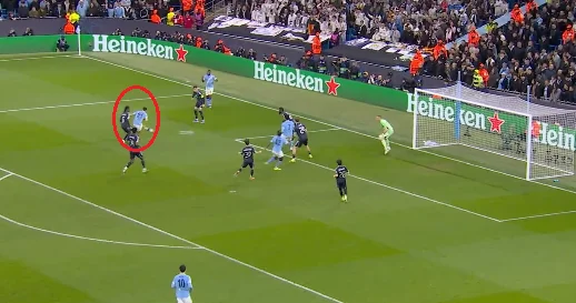 Винисиус при этом оказался первым на правом краю штрафной и подхватил отскок, мгновенно пробив в ближний угол. Ворота прикрыл Бернарду Силва, однако именно его блокировка стала роковой. Португалец вроде и держал руку прижатой, но сделал движение телом в сторону мяча и отбил его локтем.
