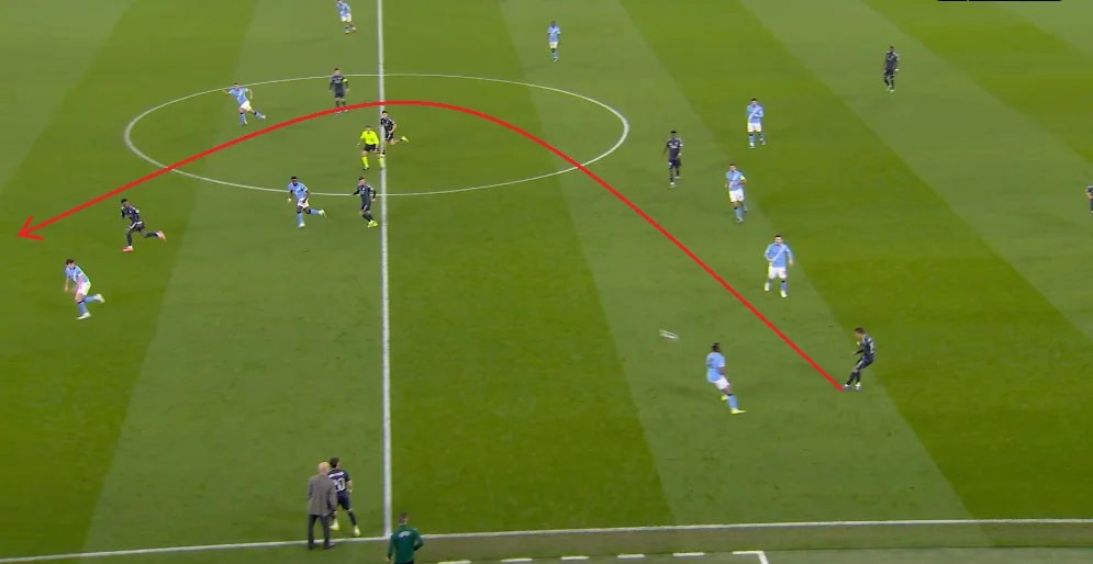 А на 17-й минуте Манчестер Сити пропустил вторую контратаку. Конечно же, флангом Винисиуса – бразильца запустили в прорыв левым флангом, а тот сместился к углу штрафной, прошел по линии и зарядил в правый нижний. Стойка спасла хозяев!