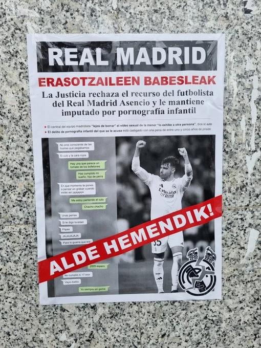 "Реал Мадрид – защитник агрессоров" и "Убирайтесь отсюда" – такие лозунги написаны на брошюре, которую болельщики Алавеса развесили по всему стадиону. Стоит напомнить, что Рауля Асенсио обвиняют в распространении откровенного видео сексуального характера с участием несовершеннолетней девушки.