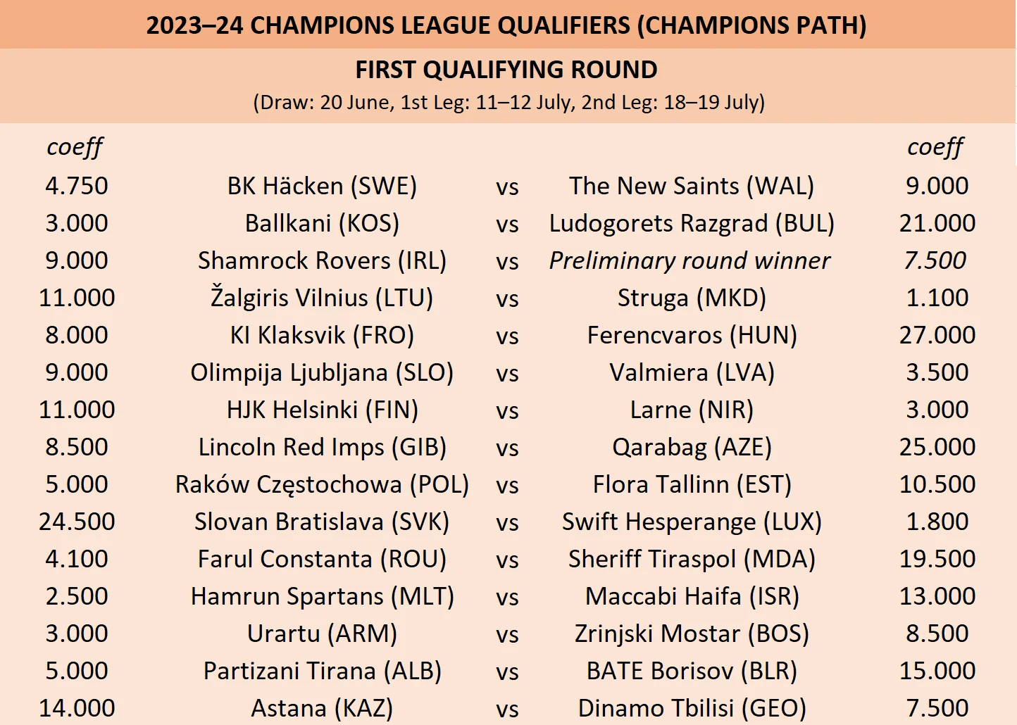 Результаты жеребьевки 1-го раунда квалификации Лиги чемпионов 2023/24: