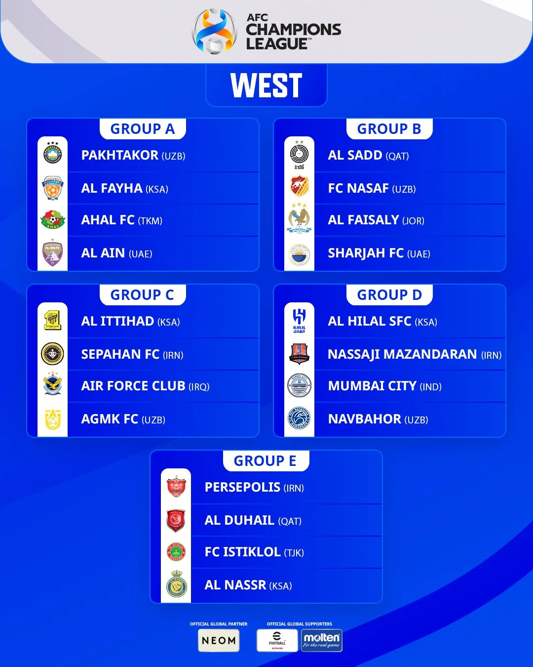 Так, Аль-Наср, который тренирует Луиш Каштру, попал в группу Е, где соперниками Роналду и Ко станут Аль-Духаиль (Катар), Истилол (Таджикистан) и Персеполис (Ирак).