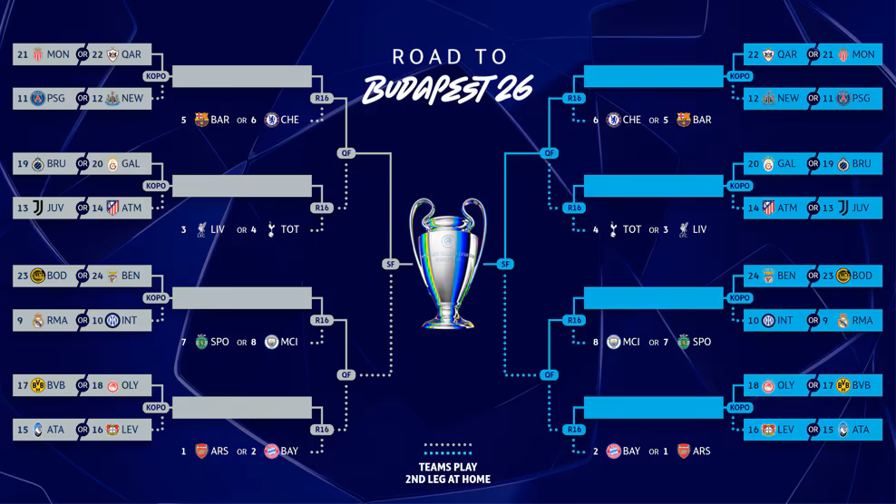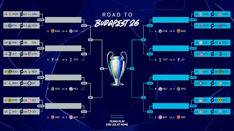 Восемь лучших команд общего этапа (Арсенал, Бавария, Ливерпуль, Тоттенхэм, Барселона, Челси, Спортинг и Манчестер Сити) вышли в 1/8 финала. Команды, занявшие 9-24 места, проведут стыковые матчи. Звездным гостем жеребьевки стала легенда Арсенала и сборной Франции Робер Пирес.