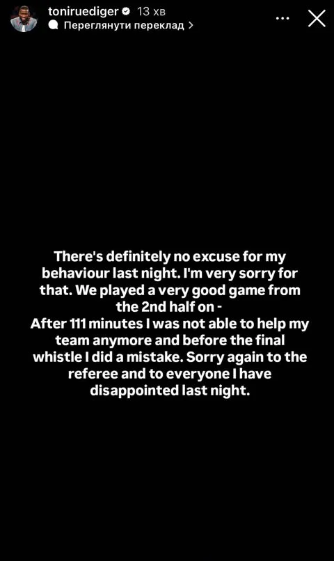 После 111-й минуты я уже не мог помогать команде, а перед финальным свистком своим поведением я совершил ошибку. Прошу прощения арбитров и всех, кого вчера разочаровал", – написал немец в своих соцсетях.