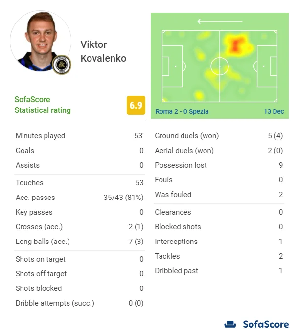 К сожалению, в первом тайме Коваленко ничем не запомнился, да и в начале второго украинец ничего экстраординарного не продемонстрировал. Правда, он и не провалился, неплохо проявив себя в единоборствах и выдав хорошую точность передач. Тьяго Мотта заменил его на 53-й минуте, выпустив Агудело.