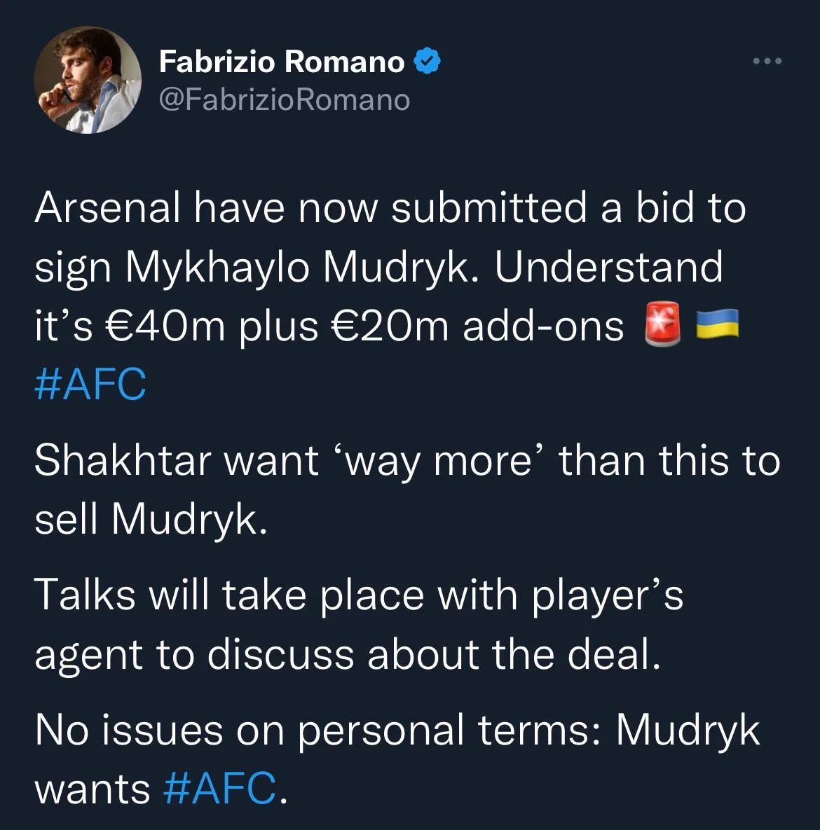 Однако, слухи понемногу начинают обрастать мясом. Новость подтвердили сразу несколько источников: журналист The Guardian Ник Аймс и известный инсайдер Фабрицио Романо. Последний, в частности, рассказал о сумме сделки. По его информации, Арсенал предложил за Мудрика 40 миллионов евро и 20 миллионов в виде бонусов.