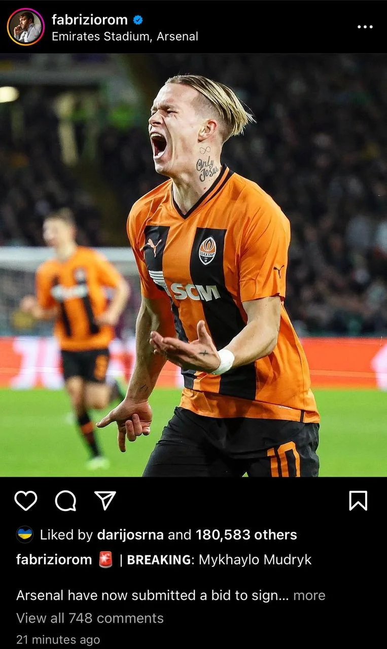 Романо озвучил подробности предложения Арсенала по Мудрику – Шахтер хотел гораздо большего