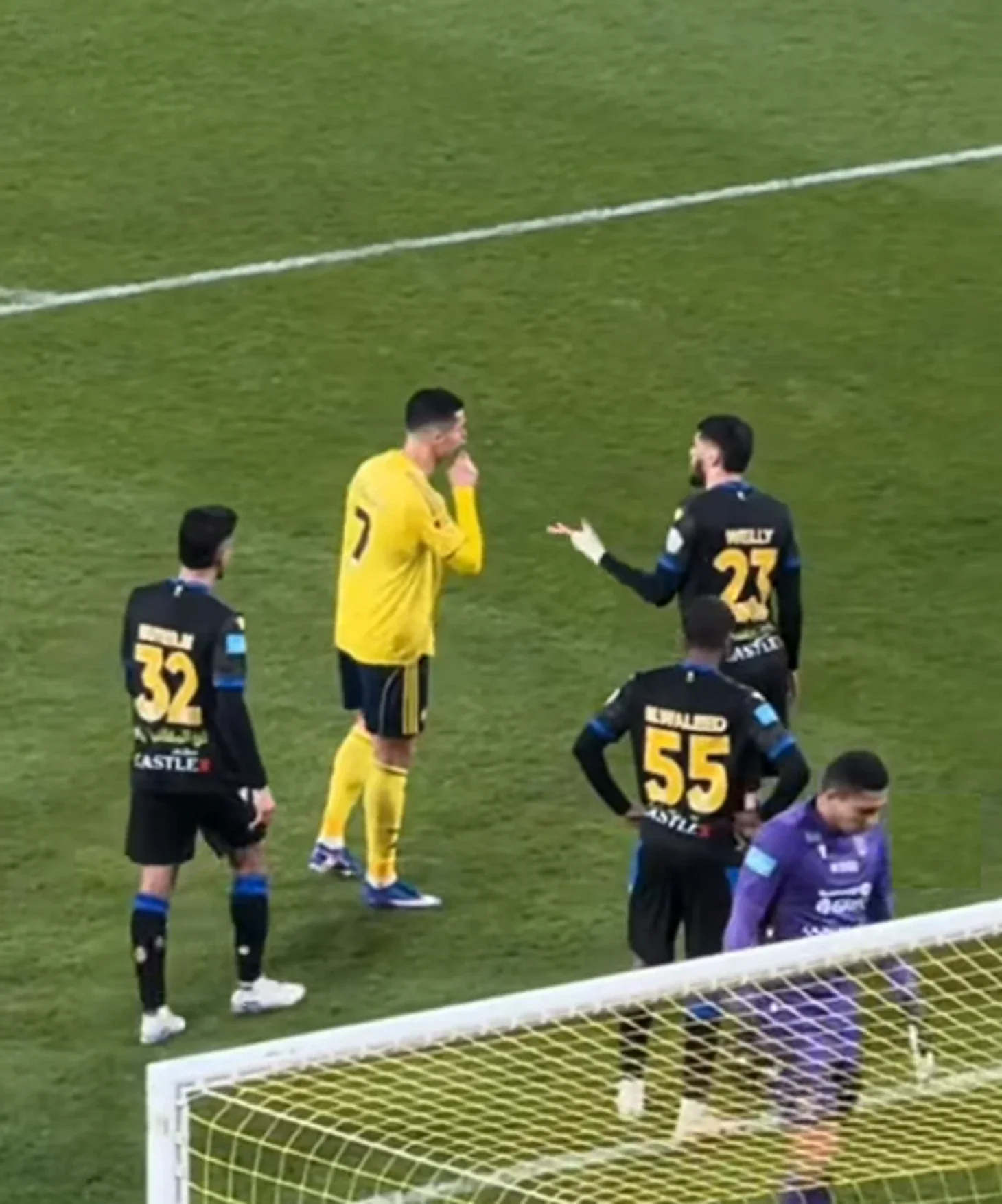 После этого Валид Аль-Ахмад что-то крикнул Роналду, а тот сначала приложил палец к губам, а потом взмахами ладони показал, что игроку Аль-Тавуна следует успокоиться. Криштиану сказал ему закрыть рот, снова повторил свои жесты и произнес: "Успокойся".