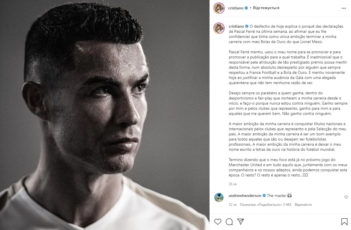 "Сегодняшний результат объясняет заявления Паскаля Ферре на прошлой неделе, когда он сказал, что я признался ему, что моя единственная цель – завершить карьеру с большим количеством "Золотых мячей", чем у Месси. Паскаль Ферре солгал, он использовал мое им чтобы продвигать себя и продвигать издание, в котором он работает.