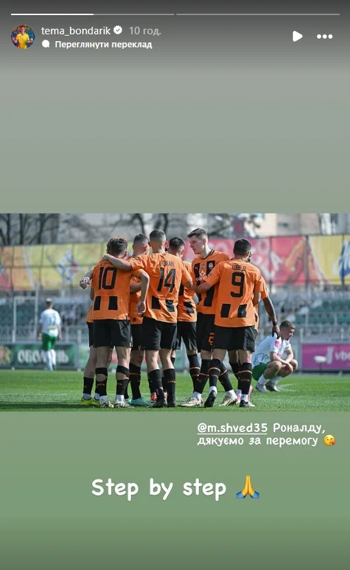После игры полузащитник "горняков" Артем Бондаренко на своей странице в социальной сети Instagram опубликовал фотографию с поединка, тегнув Шведа, которую подписал следующими словами: "Роналду, спасибо за победу". Также он добавил: "Step by step" (шаг за шагом, – прим).