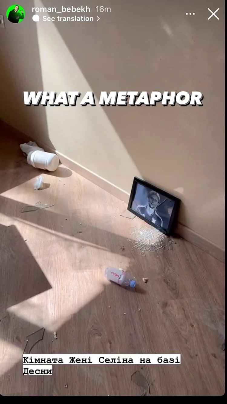 08:08. Символическое фото из базы Десны. В комнате экс-динамовца Евгения Селина следы того, что несет русский мир. Разбито даже фото фаната путинских нацистов, некогда известного украинского футболиста Анатолия Тимощука.