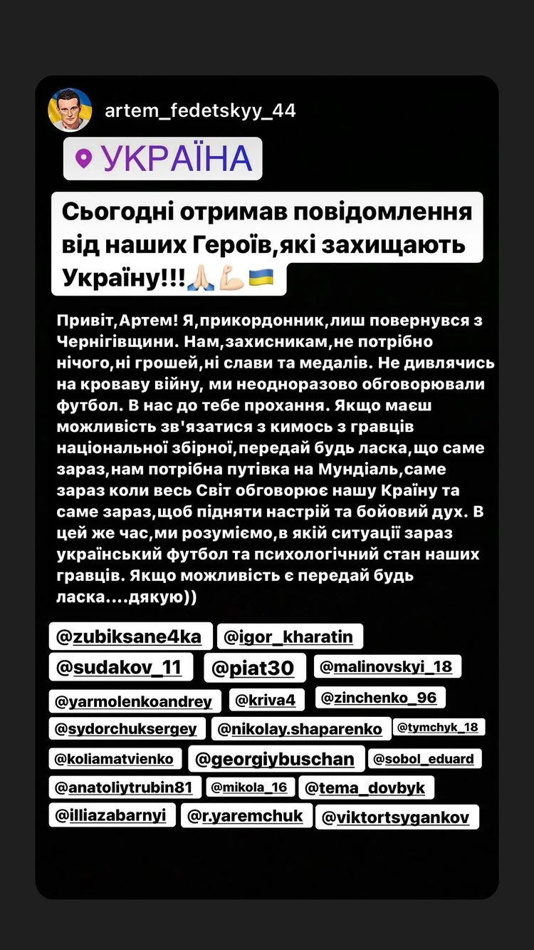 15:55. Артем Федецкий поделился сообщениями украинских пограничников. Наши защитники мечтают, чтобы "сине-желтая" сборная подарила столь настрадавшимся людям большой праздник и попала на Чемпионат мира.