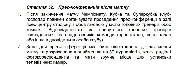 К слову, статья 52 Регламента УПЛ предусматривает обязательное участие тренеров обеих команд в послематчевой пресс-конференции. Ответственность за присутствие наставника возлагается на представителей команды.