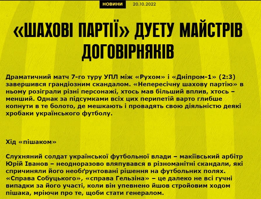 На своем сайте Рух выложил материал с заголовком "Шахматные партии" дуэта мастеров договорняков". Сначала прошлись по арбитру Юрию Иванову, который "специально" назначил пенальти в ворота Руха в конце первого тайма, а позже добавил больше компенсированного времени, чем ожидалось, и засчитал гол Логинова.