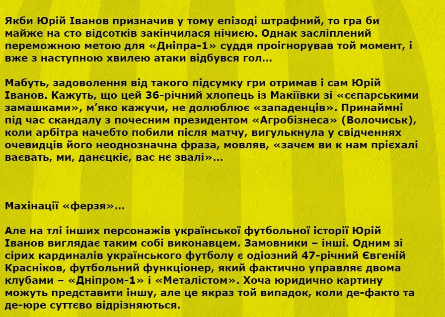 Дальше клуб будто бы обнаружил заказчиков. Главным из них стал спортивный директор СК Днепр-1 Евгений Красников, которому вспомнили скандальный матч Металлист – Карпаты и дисквалификацию от футбола, а также участие Металла во Второй лиге в обход любительского чемпионата.