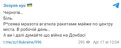 "Чернигов. Боль. Руснявая мразь вбила ракетами почти по центру города. В рабочий день.
