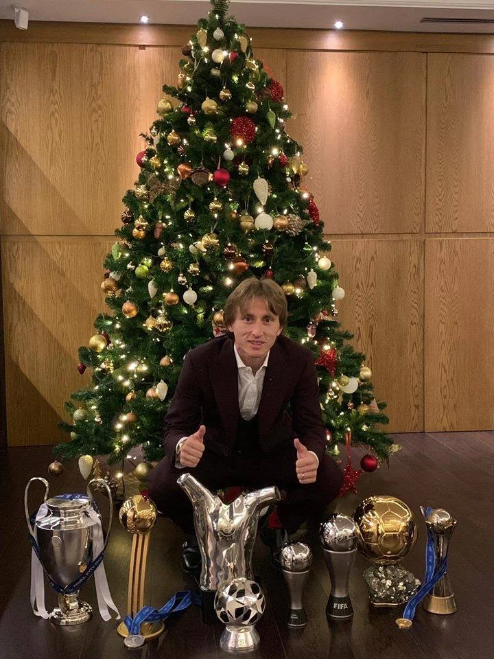 Полузащитник мадридского Реала и сборной Хорватии Лука Модрич на своих страницах в соцсетях опубликовал фото на фоне новогодней елки со своими многочисленными трофеями, добытыми в прошлом году.