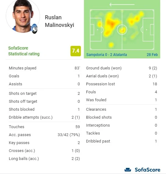Теперь уже бергамаски претендовали на пенальти. Меле пятой попытался поразить ворота из пределов вратарской. Попадание в руку, считают судьи, хотя круглый определенно остановил свой путь к воротам. Малиновский обыгрался с Муриелем и порвал дальнюю девятку роскошным ударом с левой. Второй гол 27-летнего украинсца в сезоне Серии А, третий во всех турнирах. Руслан трудновато начал, проиграл большинство борьбы (выиграл 2 из 7 единоборств), стал вторым по потерям в команде (11), но по итогам первого тайма стал игроком матча (7,1 от SofaScore, 7,5 от FootballCritic). Реализовал 50% своих ударов в створ, мог отличиться и ассистом, если бы партнеры быстрее думали.