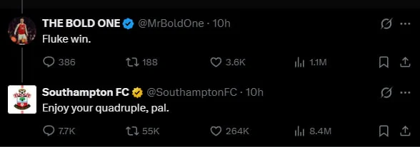 Пресс-служба Саутгемптона в соцсети Х подколола фаната Арсенала, написав: "Наслаждайся квадруплом". Напомним, что кроме вылета из Кубка Англии, "канониры" в марте проиграли Манчестер Сити (0:2) в финальном поединке Кубка лиги.
