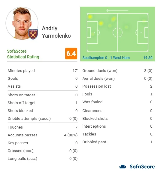 Статистика украинца в матче Саутгемптон – Вест Хэм выглядит довольно скромной. Лишь 7 контактов с мячом, 4 точных передачи, ни одного выигранного единоборства и 2 потери мяча. От британских СМИ Ярмоленко получил посредственные оценки – журналисты не выделили ничего особенного в игре украинца. Так оно и было – очередной посредственный матч лидера сборной Украины. Что ж, пауза, возникшая для Вест Хэма в АПЛ, является шансом для Андрея найти свою форму.